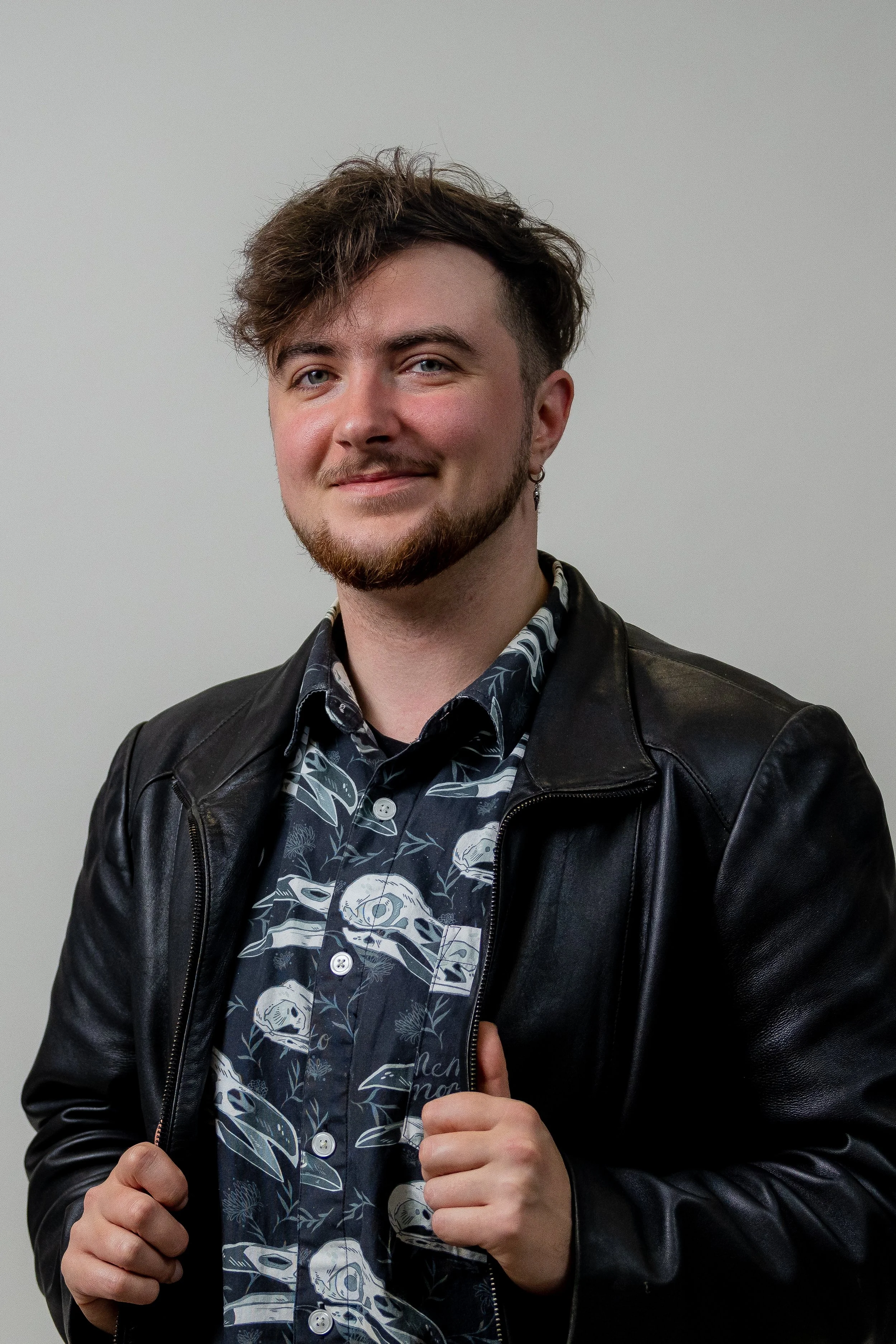 A young man with brown hair, beard, and earrings, smiling and wearing a black leather jacket over a patterned shirt, standing against a plain light gray background.